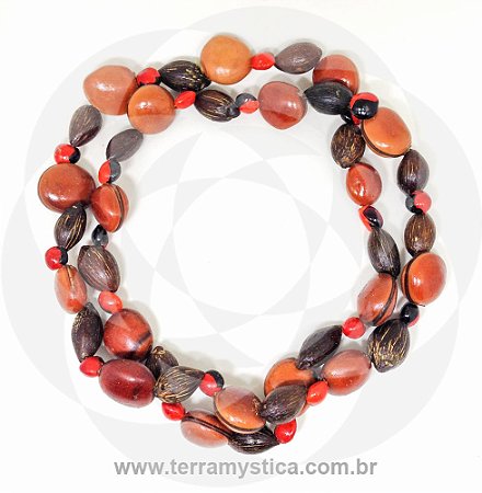 Olho de boi, olho de cabra, contas amarelas ou brancas e pode ter um crucifixo.